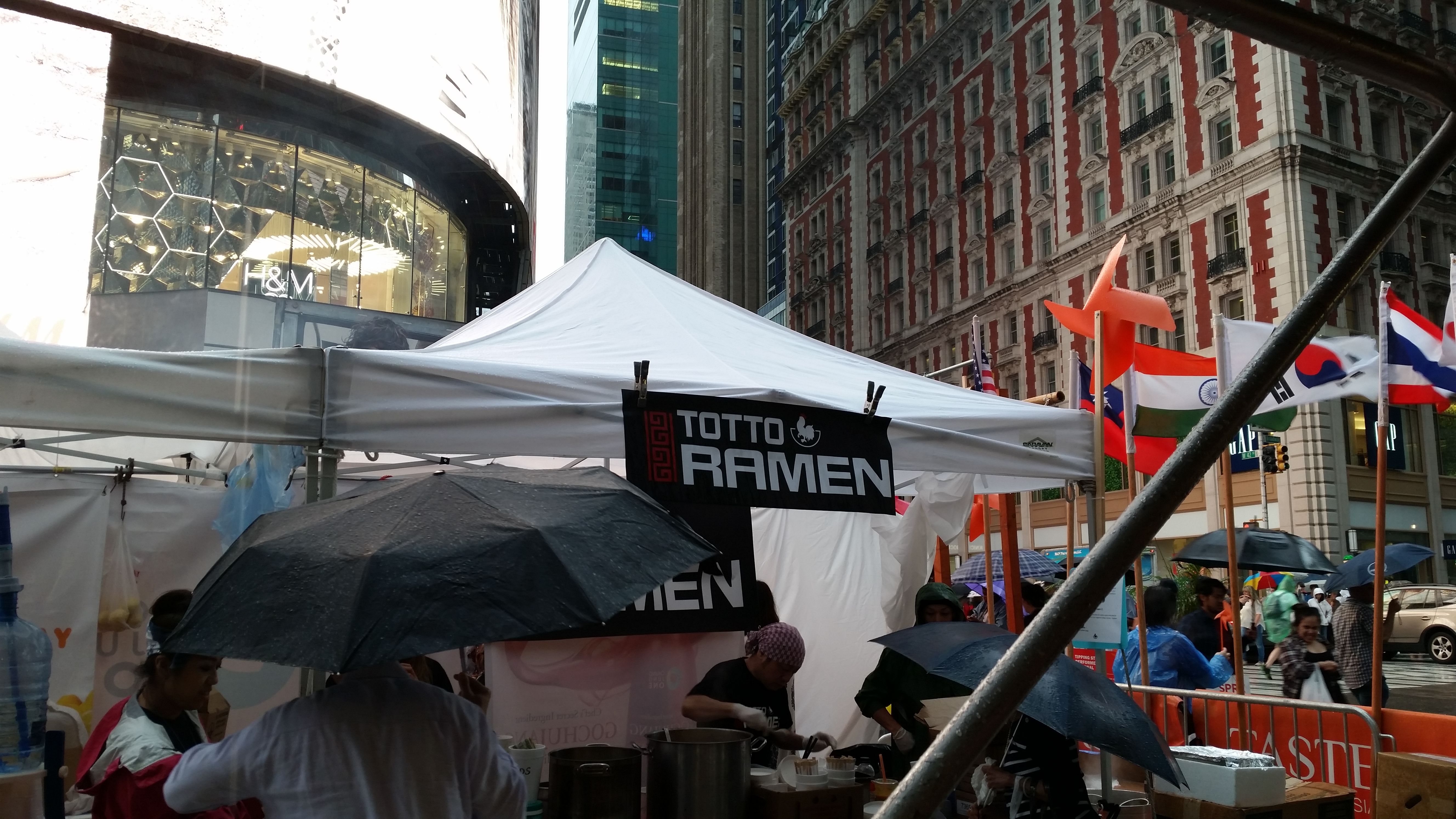 Other than the scrumptious food, there was also the international Chinese food culinary competition. I couldn’t see much because there were so many people holding umbrellas and blocking my view. All I saw was the camera crew, the MC set and the tip of the roof preventing the rain to interfere with the chef’s cooking. Everywhere we looked there were camera men holding either a log stick with a camera or a tripod. They were probably from different TV stations like NTDTV. The MC set was were the narrators/judges sat for the competition.There were three narrators/judges. Each one of them explained what was going on during the process of making the different foods. They also gave tips and ratings for every dish. The little lodge the chefs cooked under had the coolest roof ever! It was a red roof that looked like a the ones they had in China for temples and other events. It also had a very detailed design on the edge.