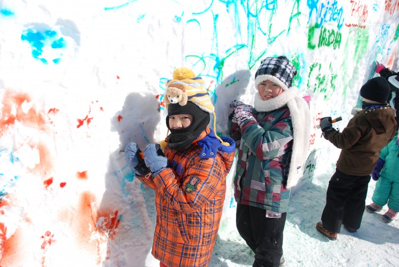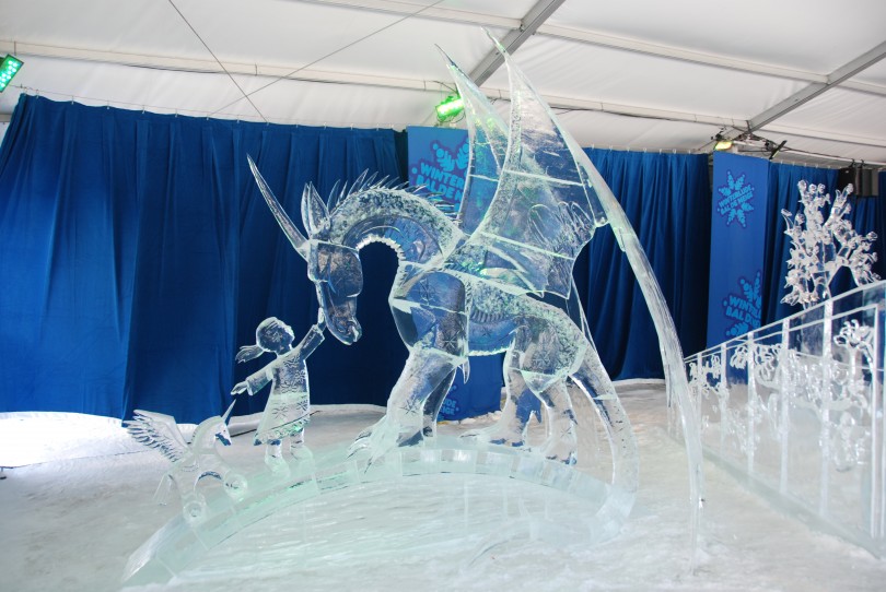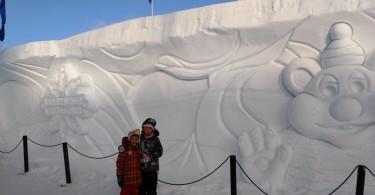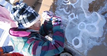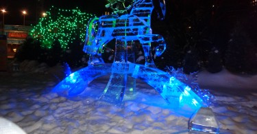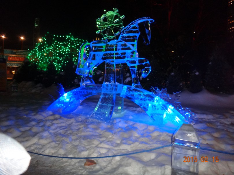At the end, we were able to chisel away the outer edge of the sculpture. It didn’t look like a major improvement, but it took us a long time just to accomplish that. We took our goggles off and went exploring the rest of Crystal Garden. Crystal Garden had so many ice sculptures! (Maybe that’s why it’s called Crystal Garden.) I saw some cool ice sculptures with… peculiar themes. One of them had a lantern shining on a hand which was trying to make a shadow puppet of an eagle. Another one looked like a tiny backyard. The ice sculptures were illuminated at night. I also had a chance to have taffy on snow. It is one of my favorite winter treats!