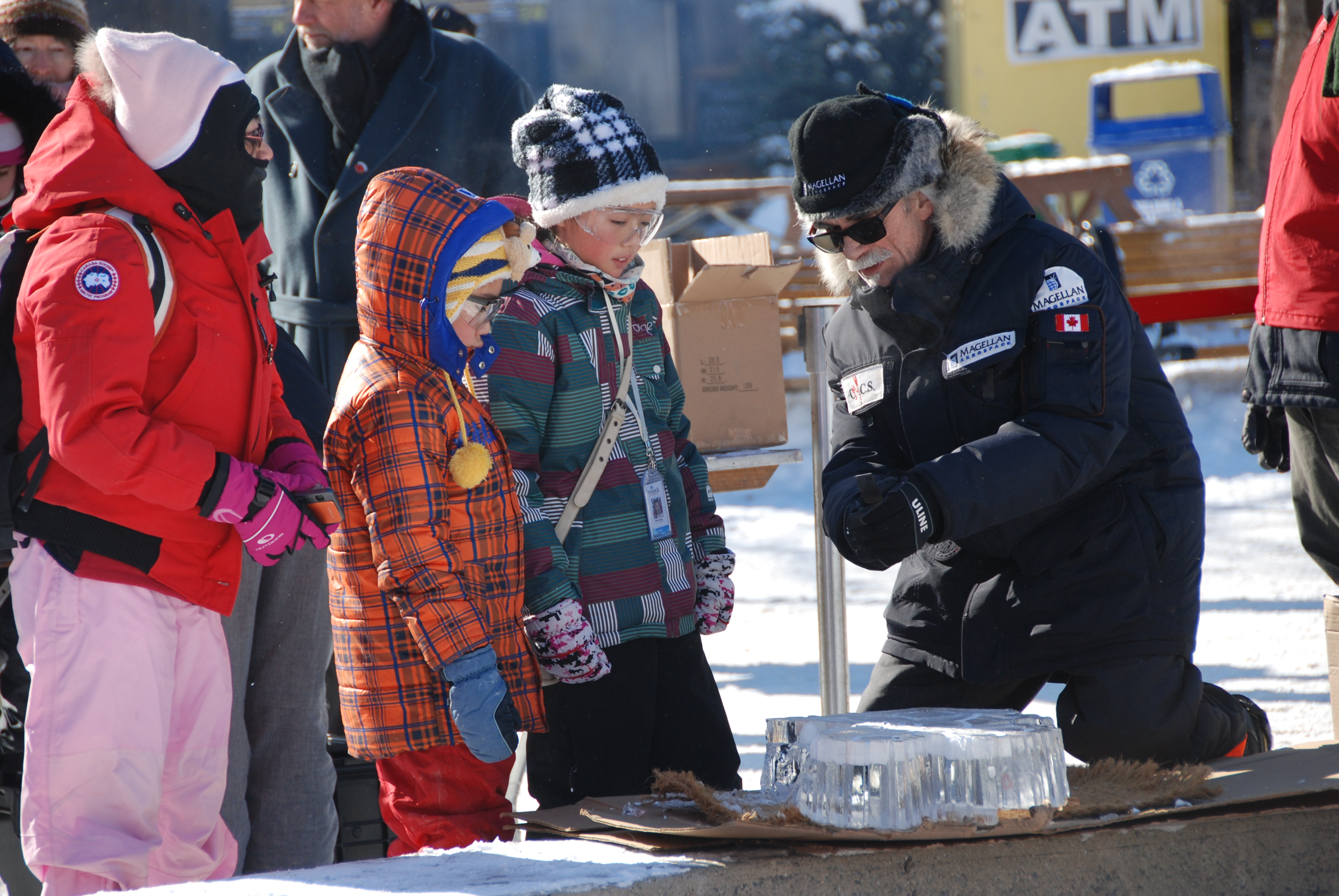 When my family arrived at Ottawa, we saw a lot of signs for Winterlude. The first site my family visited was Crystal Garden. The first activity we did there was learning the basics of ice carving and how to use a chisel. We were greeted by Kenny Hayden, the ice carving instructor, at a fountain. Around the fountain, there were a bunch of stations with a little pre-mold ice sculpture at each of them. We were handed safety goggles before we headed to our stations. My brother and I chose a puppy to carve. We were given instructions on how to carve safely with a chisel. I soon got to try ice carving on my own. It’s harder than it looks! Luckily, I was given a couple tips: