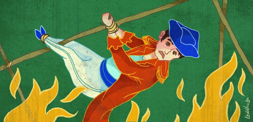 When I opened my eyes, I thought, “Surely this is the end. I am currently tied on a spit and the merciless horrors are roasting me and I am engulfed in flames.” I heard a voice next to my ear, and it said something like, “O gala—”