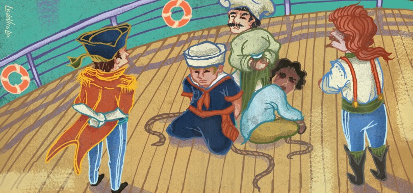 I told the captain about these notorious villains. Together, we worked up a plan. We stayed up until midnight, with the security guards of the boat. At midnight, we snuck into their cabin. The cabin boy, now a servant, was snoring so loudly one of the guards tried to leave. The first mate was hogging a huge bed of gold with exclusive silks and fox fur. He probably forced the chef to sleep on a tiny, smelly, dirty, greasy little bed that was much too small for the chef. In minutes, they were tied up, and the guards got them to tell the story.