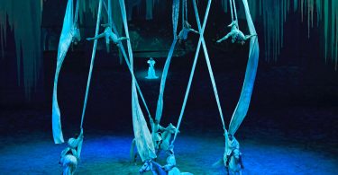 There were several different scenes in the show such as Fête du Village, Les Voyageurs, and Carosello. My favorite scene was the one called “Les Anges” which featured four acrobats with silky dresses hanging down from the top. The pulchritudinous acrobats performed beautiful moves while white horses trotted in a circle underneath them. The strikes of soft white and blue lights made the acrobats look even more beautiful. The lighting of the scene created a sense of winter. There were pictures of icicles in the background and all the outfits and horses were a sparkling white. The whole scene was very angelic and splendid.